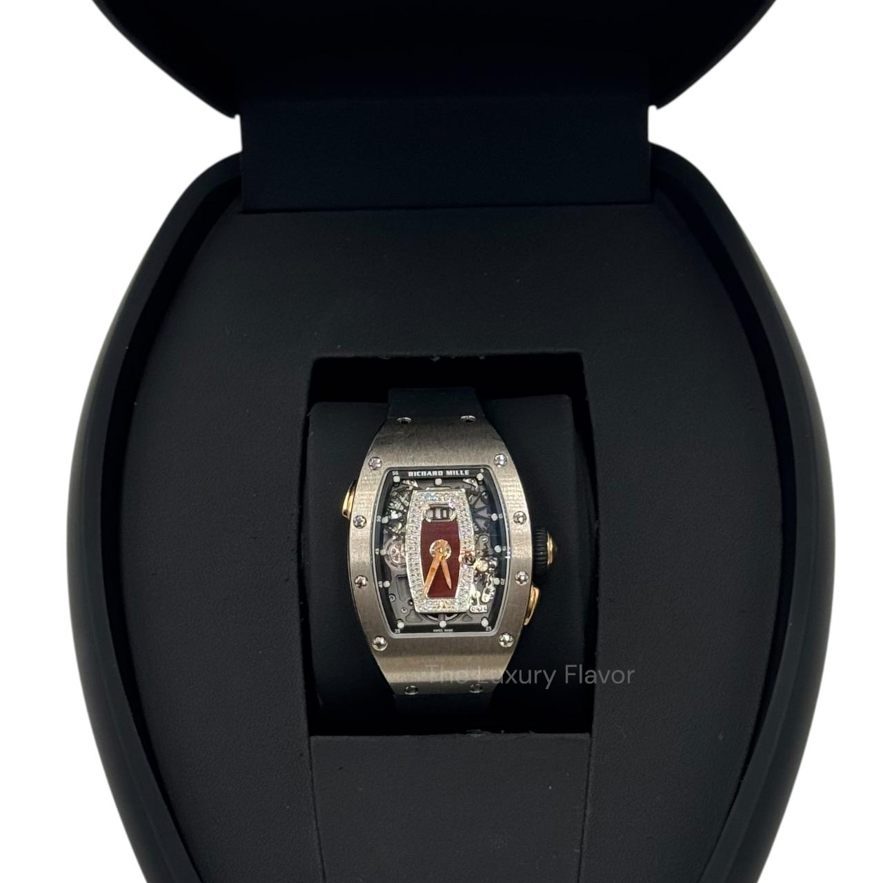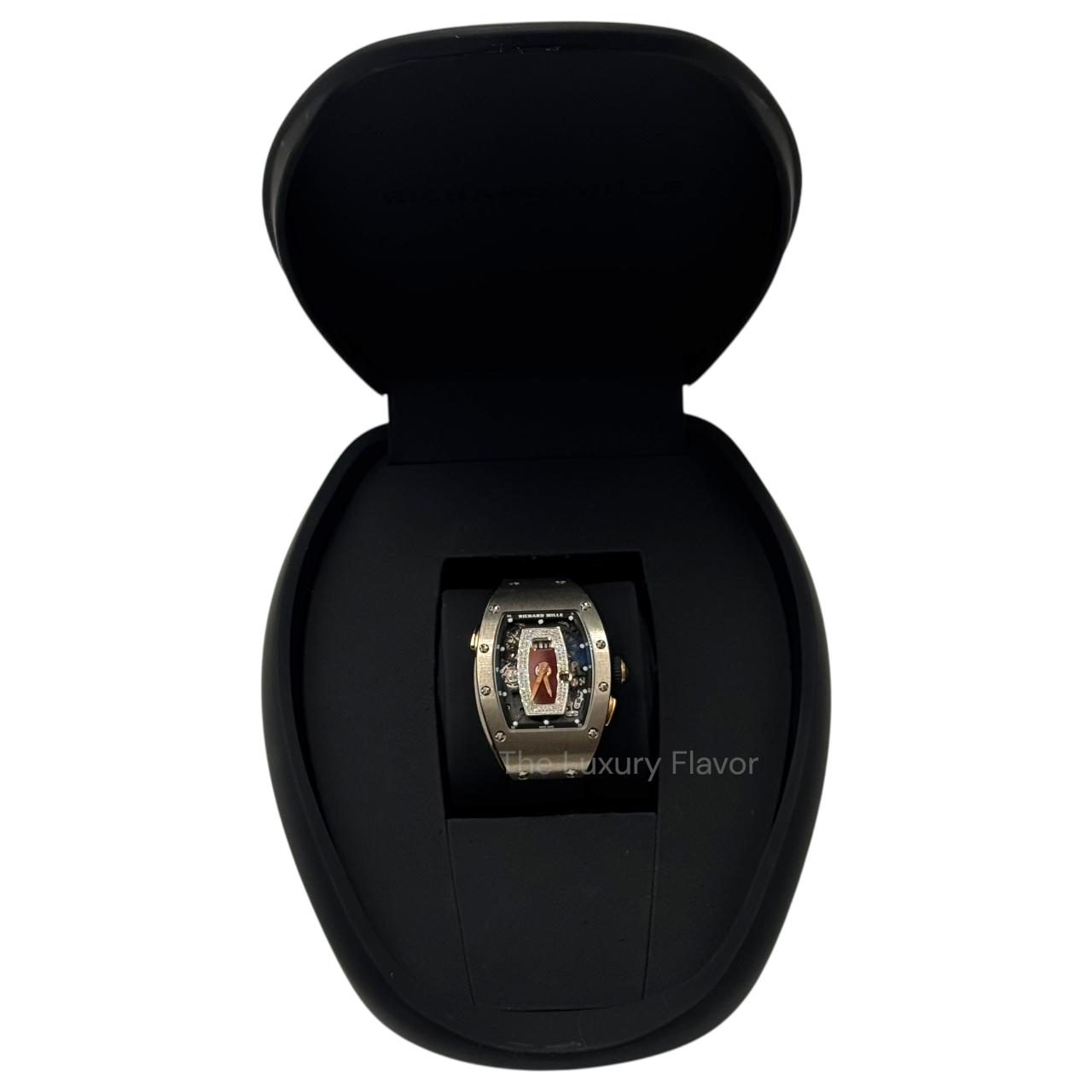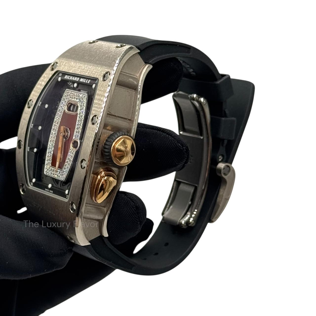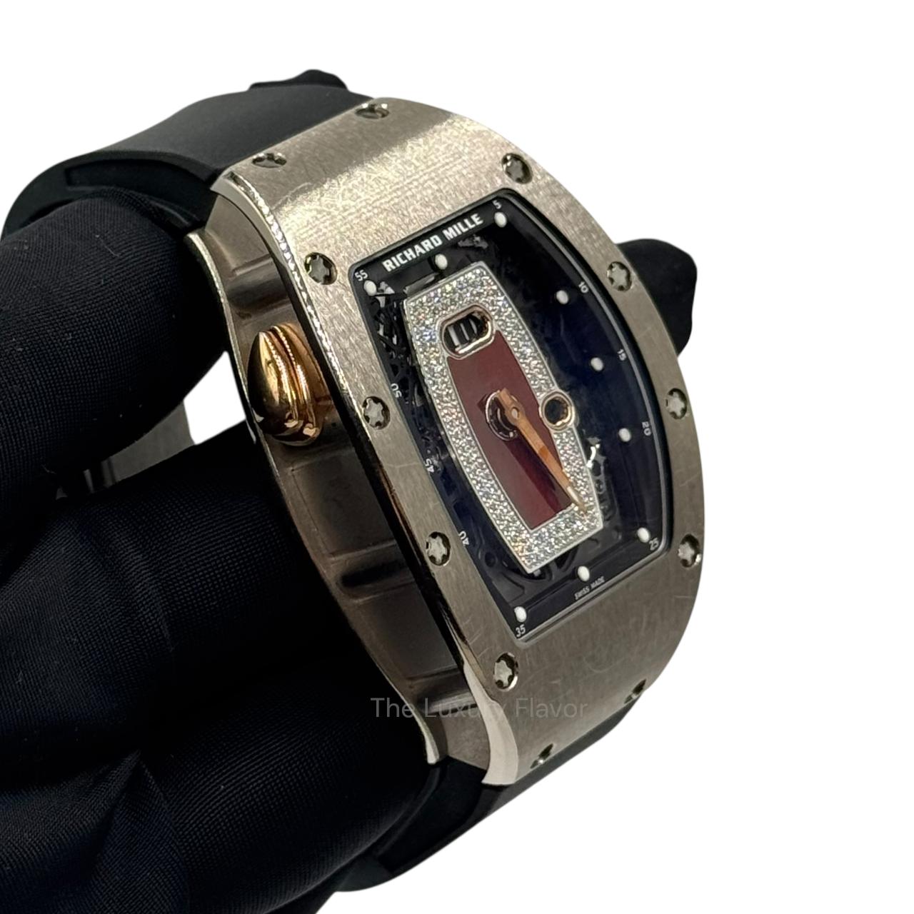 A luxurious tonneau-shaped timepiece in 18k white gold featuring a diamond-set bezel and an openworked skeletonized dial that reveals its intricate mechanics. Powered by Richard Mille’s automatic CRMA1 movement with a date display and dynamic rotor system, it blends high-end technical innovation with elegant haute-joaillerie sparkle for a standout contemporary design.