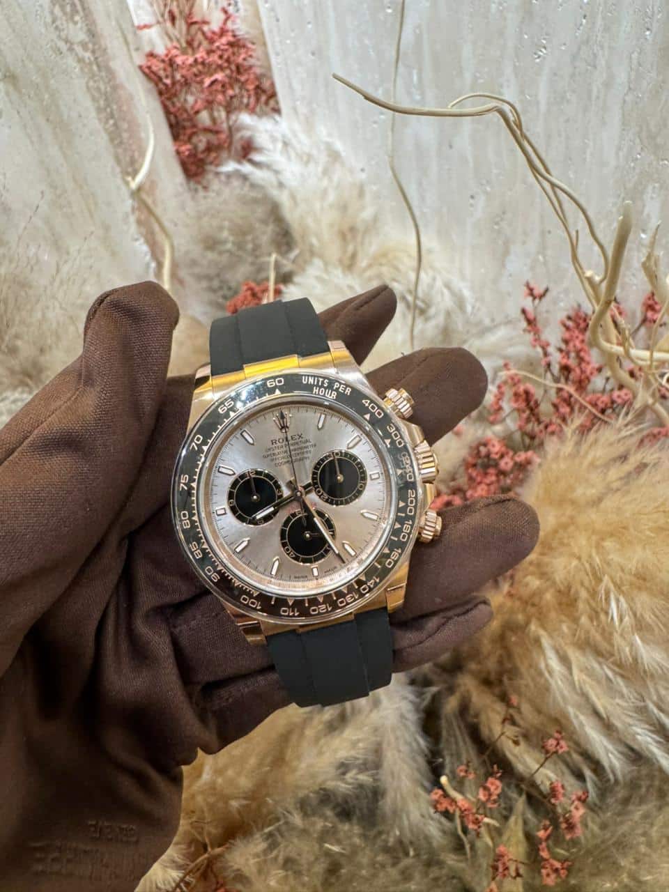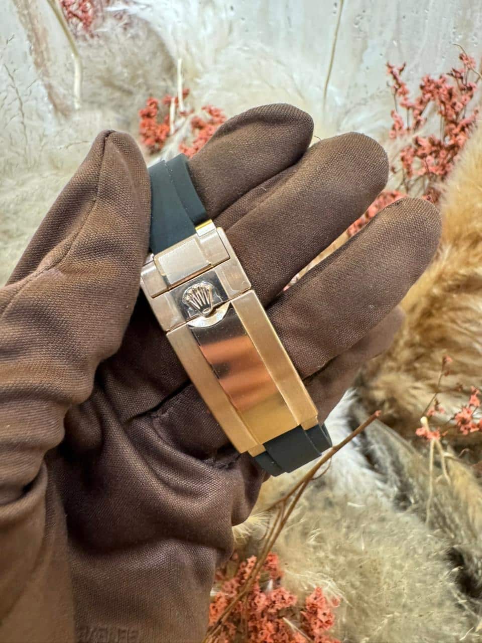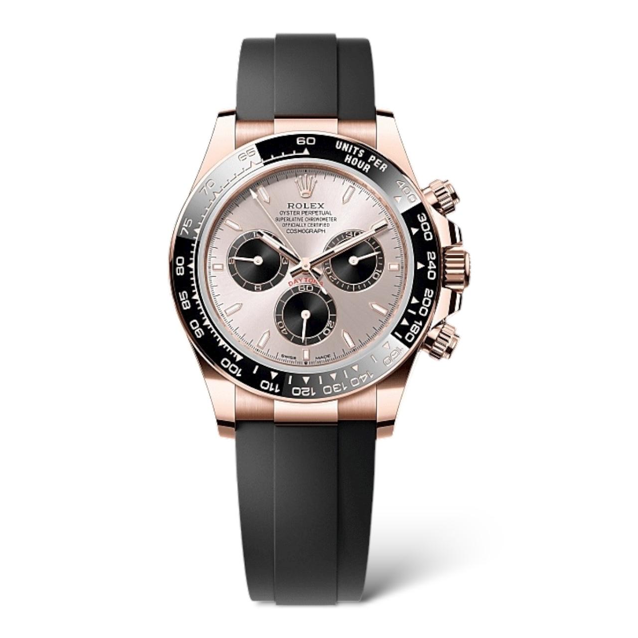 A sophisticated chronograph crafted in 18ct Everose gold, featuring a Sundust and bright black dial with elegant rose-gold accents. Fitted with a black Oysterflex bracelet and Cerachrom bezel, it blends luxury with high-performance sport design.