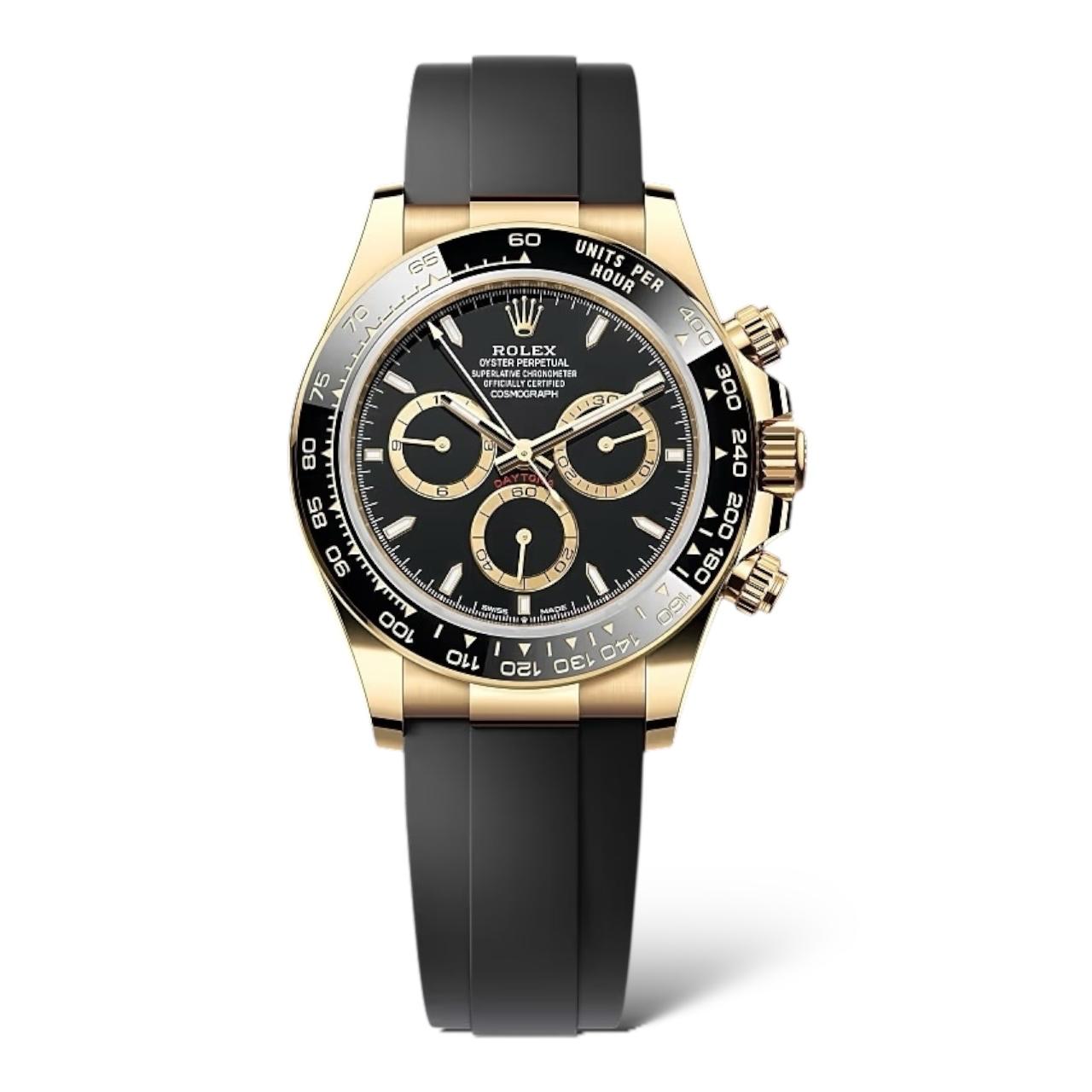 The iconic Rolex Cosmograph Daytona shines in 18k yellow gold, featuring a robust 40mm case, a tachymeter bezel, and a high-performance chronograph movement. The innovative Oysterflex bracelet offers unparalleled comfort, while the watch maintains water resistance to 100 meters.Â
