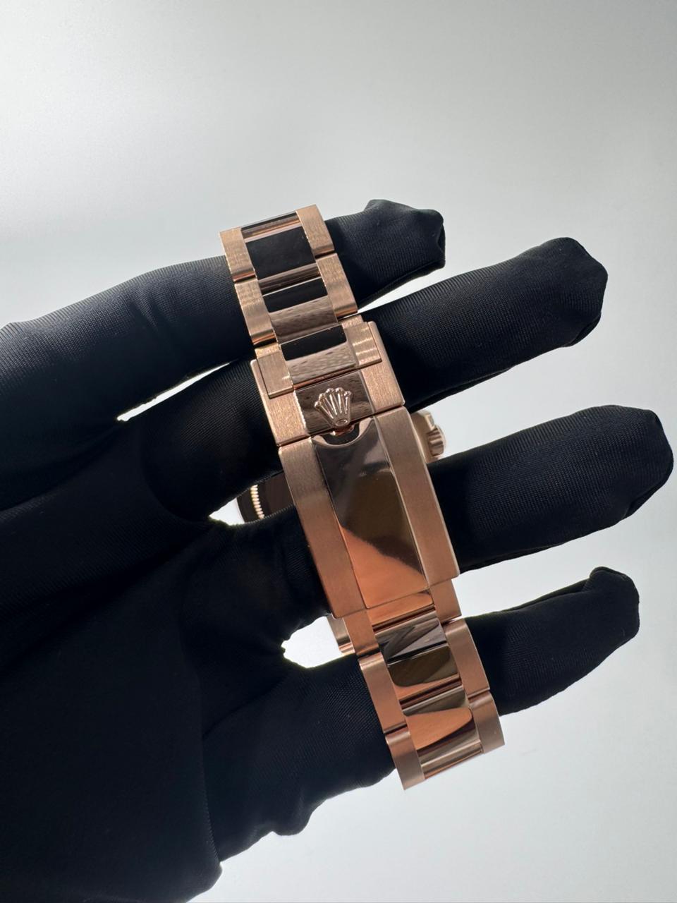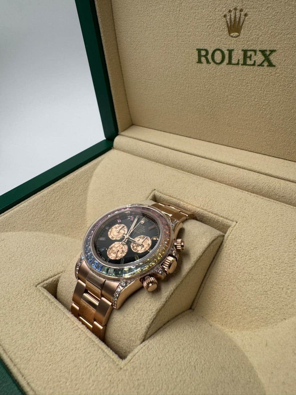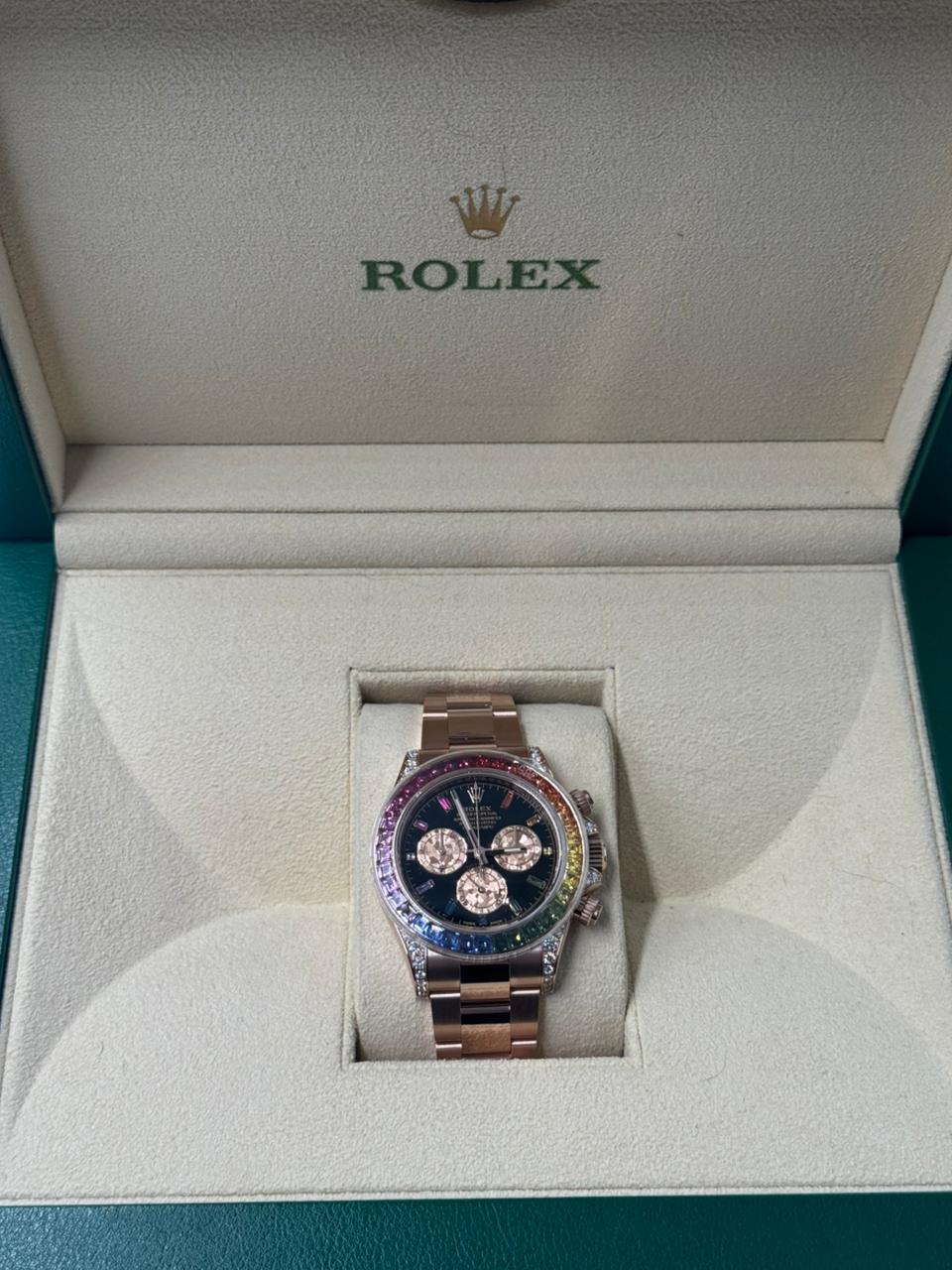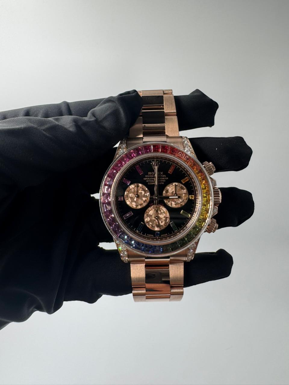 Rolex Cosmograph Daytona 40 mm crafted in 18k Everose gold, distinguished by its spectacular rainbow sapphire-set bezel with perfectly graduated sapphires, diamond-encrusted lugs, and a sleek black dial adorned with diamond hour markers. Powered by Rolex’s latest-generation automatic chronograph movement, this ultra-rare masterpiece combines high-performance motorsport heritage with exceptional gem-setting artistry and exclusivity.