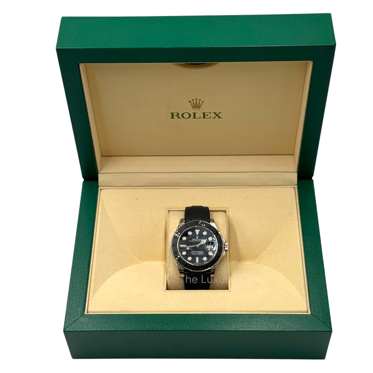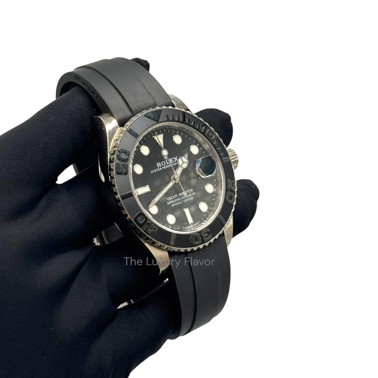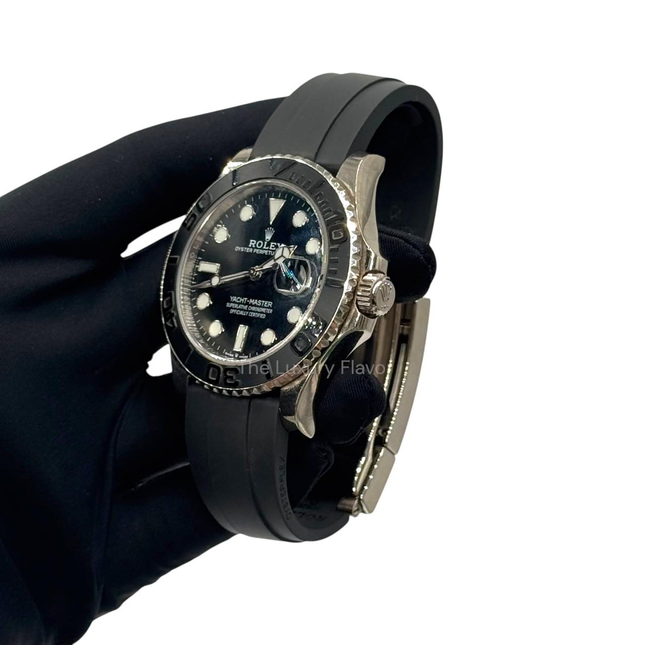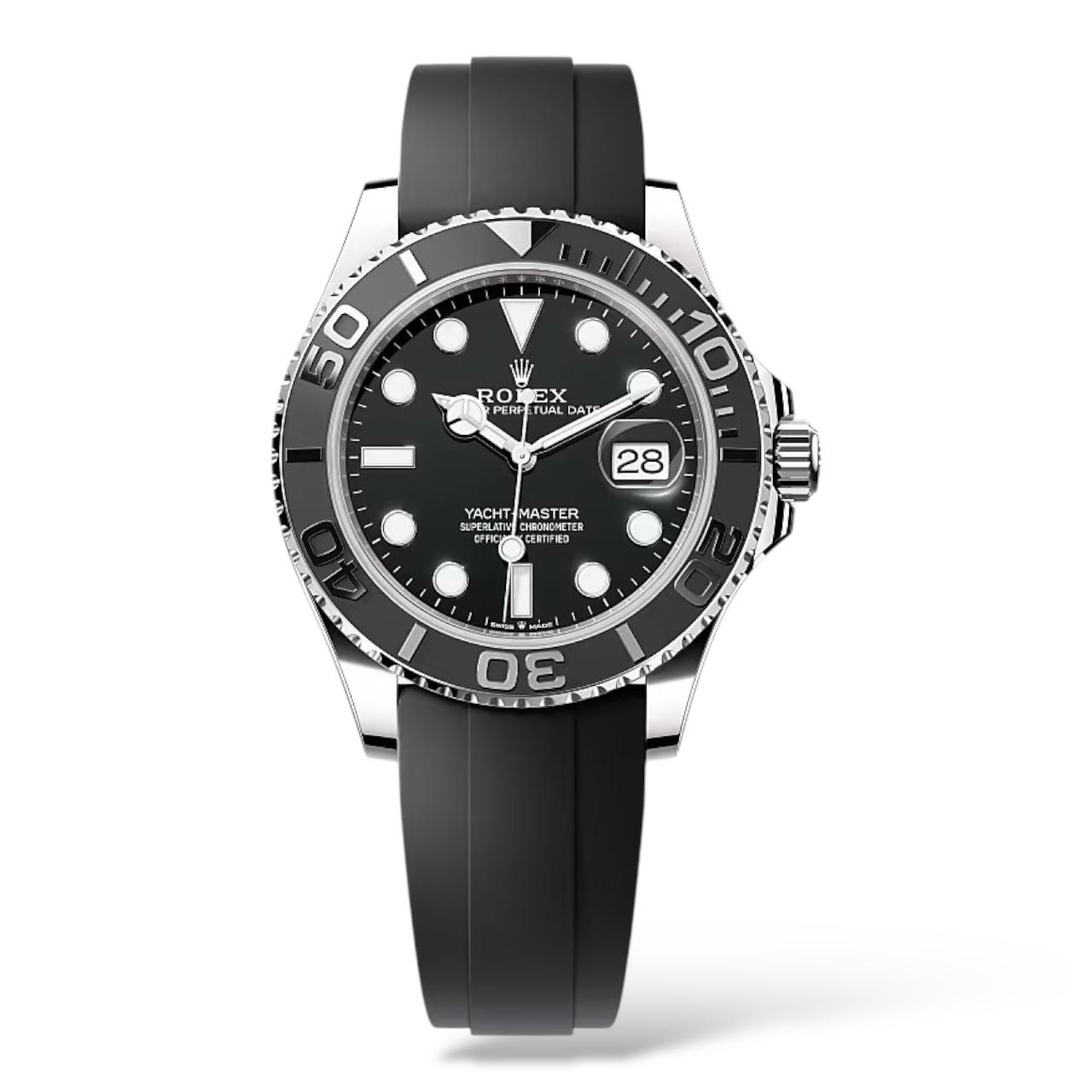 A luxury sports watch with an 18 ct white gold case, black dial and black Cerachrom bezel, mounted on a sporty Oysterflex rubber strap. It’s powered by Rolex’s high-performance automatic Calibre 3235 movement with about 70 hours of power reserve, and secured with a folding Oysterlock safety clasp with Glidelock for easy adjustment — combining robust functionality with elegant nautical style.